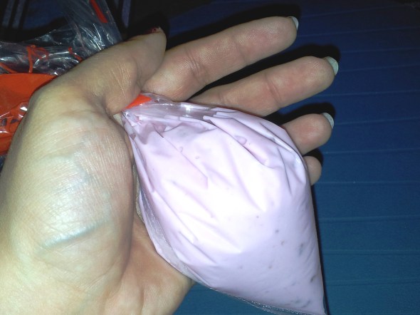 מניחים שקית סנדוויצ'ים קטנה בתוך כוס ומעבירים אליה את היוגורט