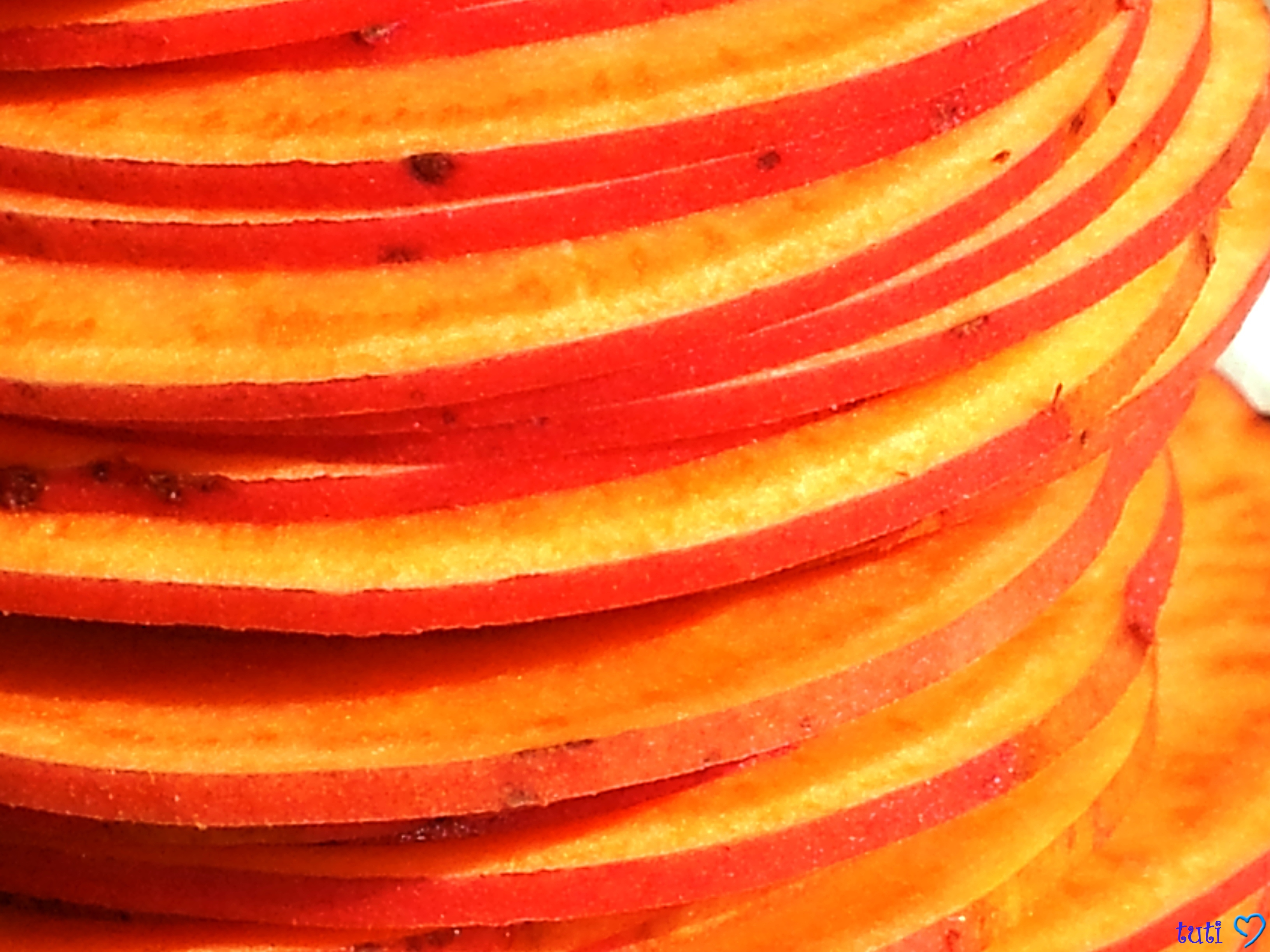 בעזרת מנדולינה או מעבד מזון, פורסים את הבטטה לפרוסות דקות.