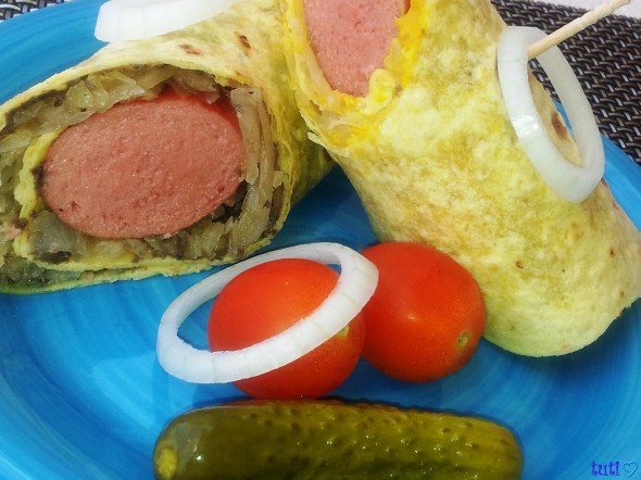 מניחים באמצע הטורטיה את הנקניקיה, מגלגלים וחותכים באמצע באלכסון.