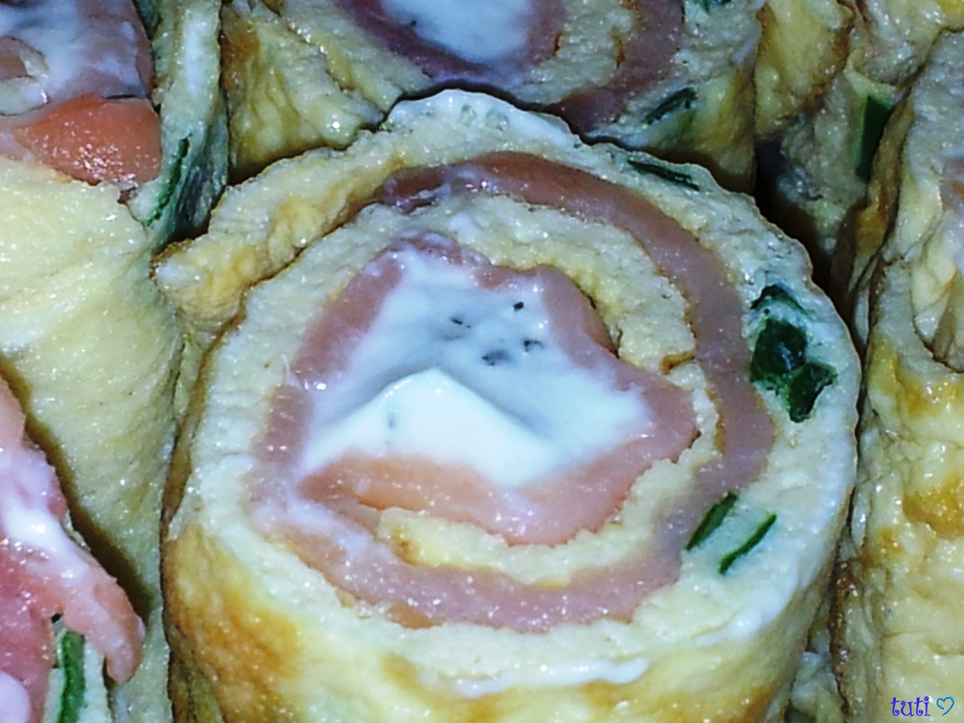היא למרוח את הגבינה בין החביתה לשכבת הסלמון ולגלגל.