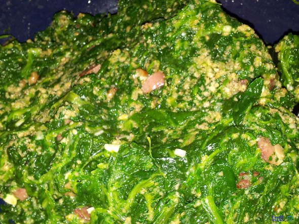 מוציאים מהמחבת ומוסיפים לעלי התרד.