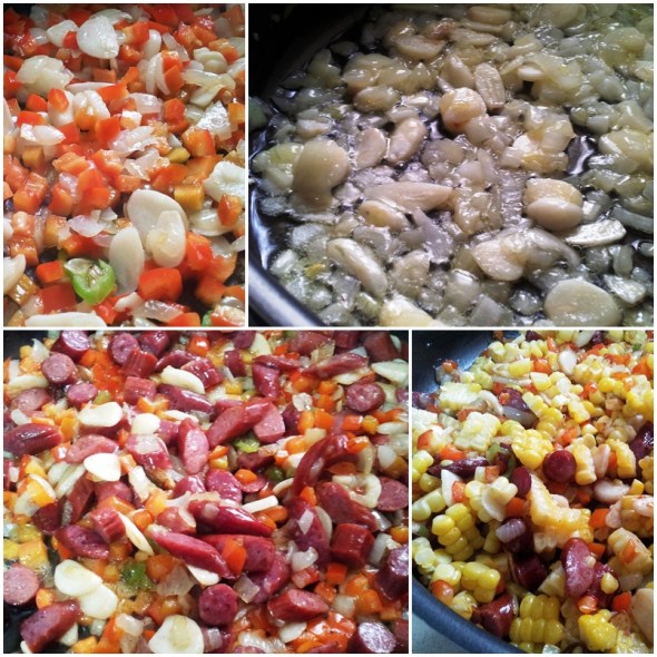 מוסיפים את הפלפל החריף, הגמבה וגרגירי התירס ומקפיצים למשך כמה דקות,