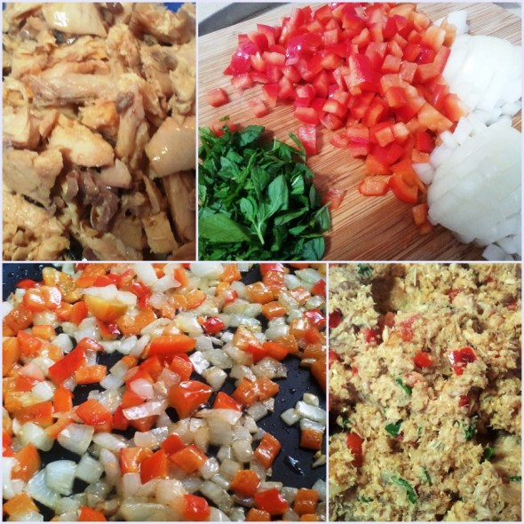 במחבת עם מעט מאד שמן זית נקפיץ את הבצל יחד עם קוביות הפלפל האדום, עד להזהבה.