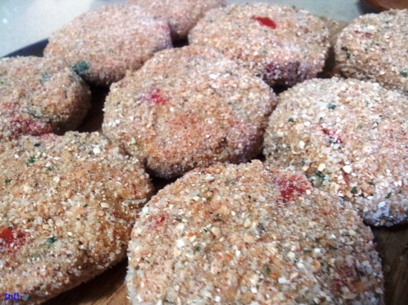 נערבב הכל, ניצור קציצות ונצפה כל אחת בפירורי לחם ונניח לעשר דקות להתייצבות.