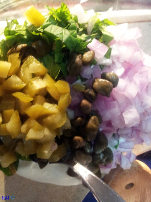 נוסיף את הצלפים, הבצל, המלפפונים החמוצים, הנענע והפלפלון (לא חייבים) ונערבב היטב.