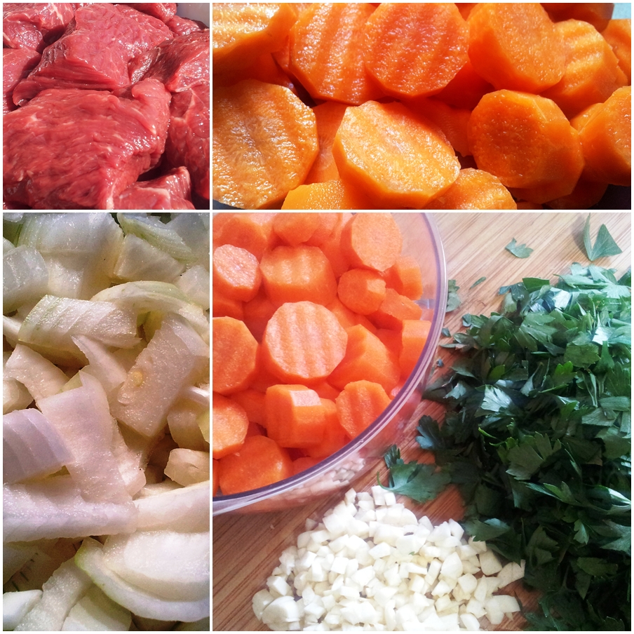 1 ק"ג בשר בקר שמתאים לתבשילי צלי חתוך לקוביות גדולות.