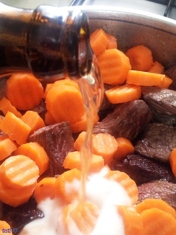 נוסיף את הבשר שצרבנו, את פרוסות הגזר ונמזוג את הבירה מעל הבשר.