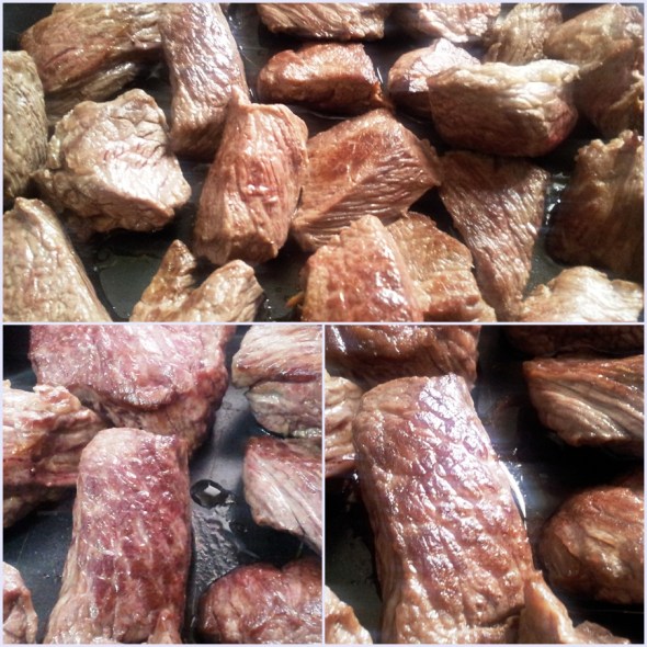 כשהשמן חם מאד נניח בזהירות את קוביות הבשר לצריבה מכל הכיוונים.