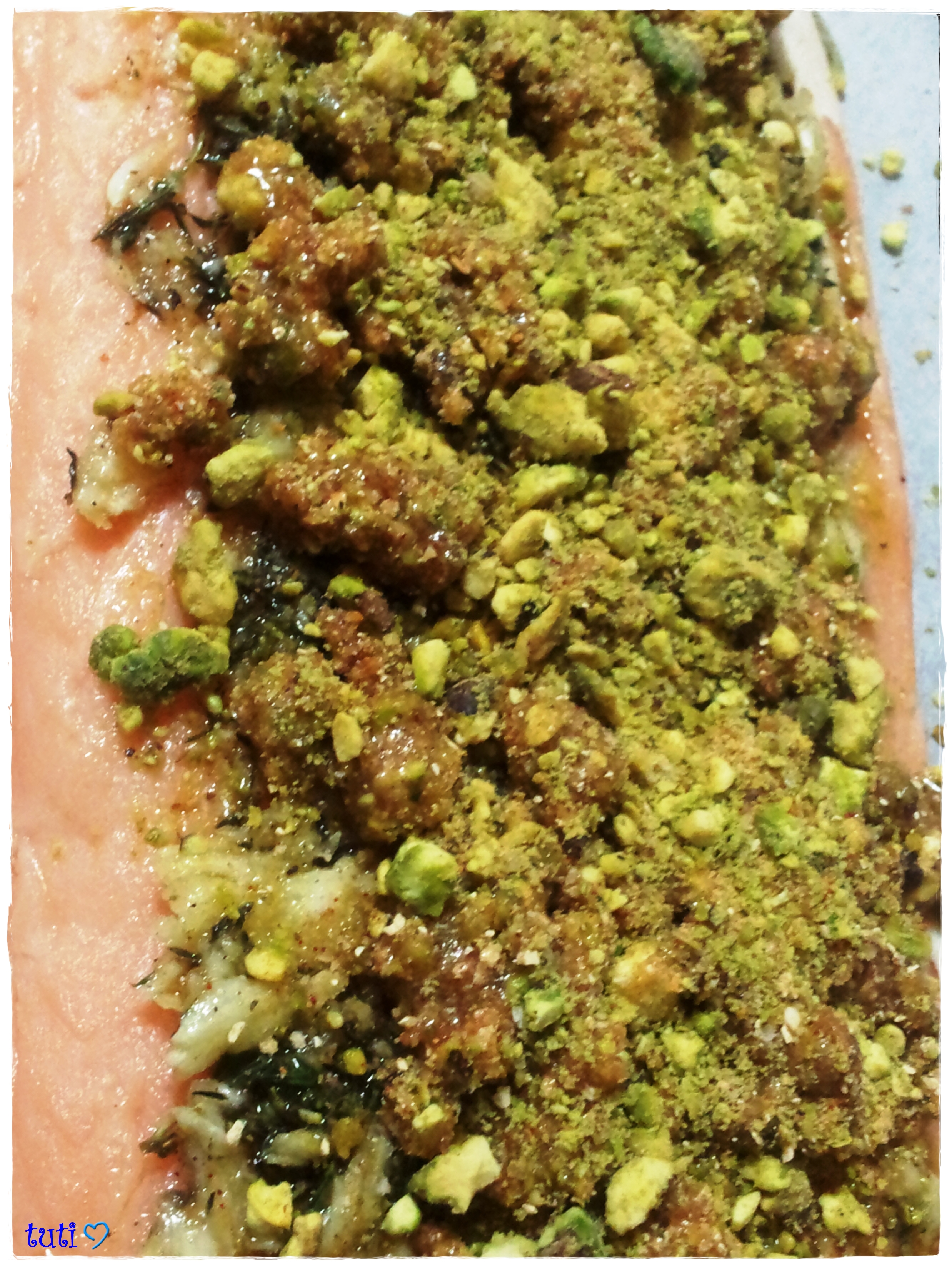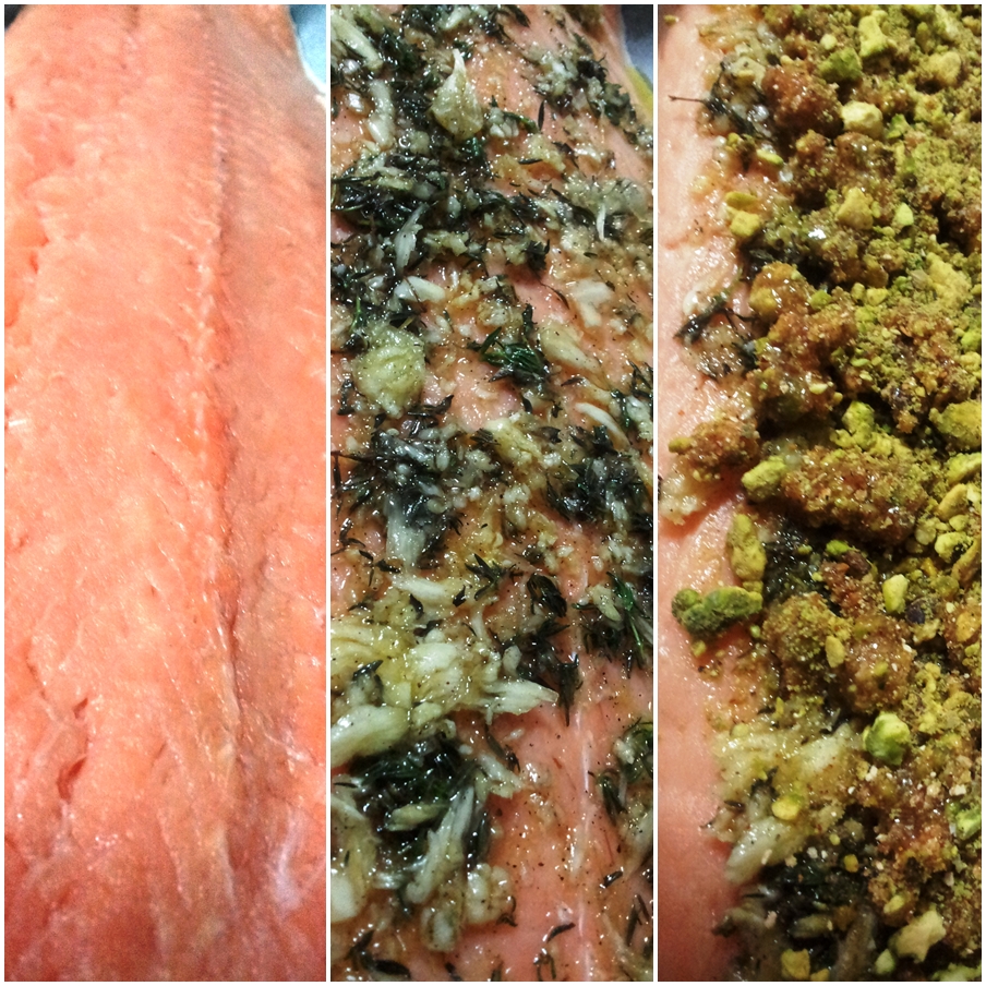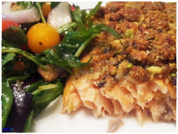 אחד המתכונים האהובים עלי שם, הוא פילה הסלמון בקראסט פיסטוקים,