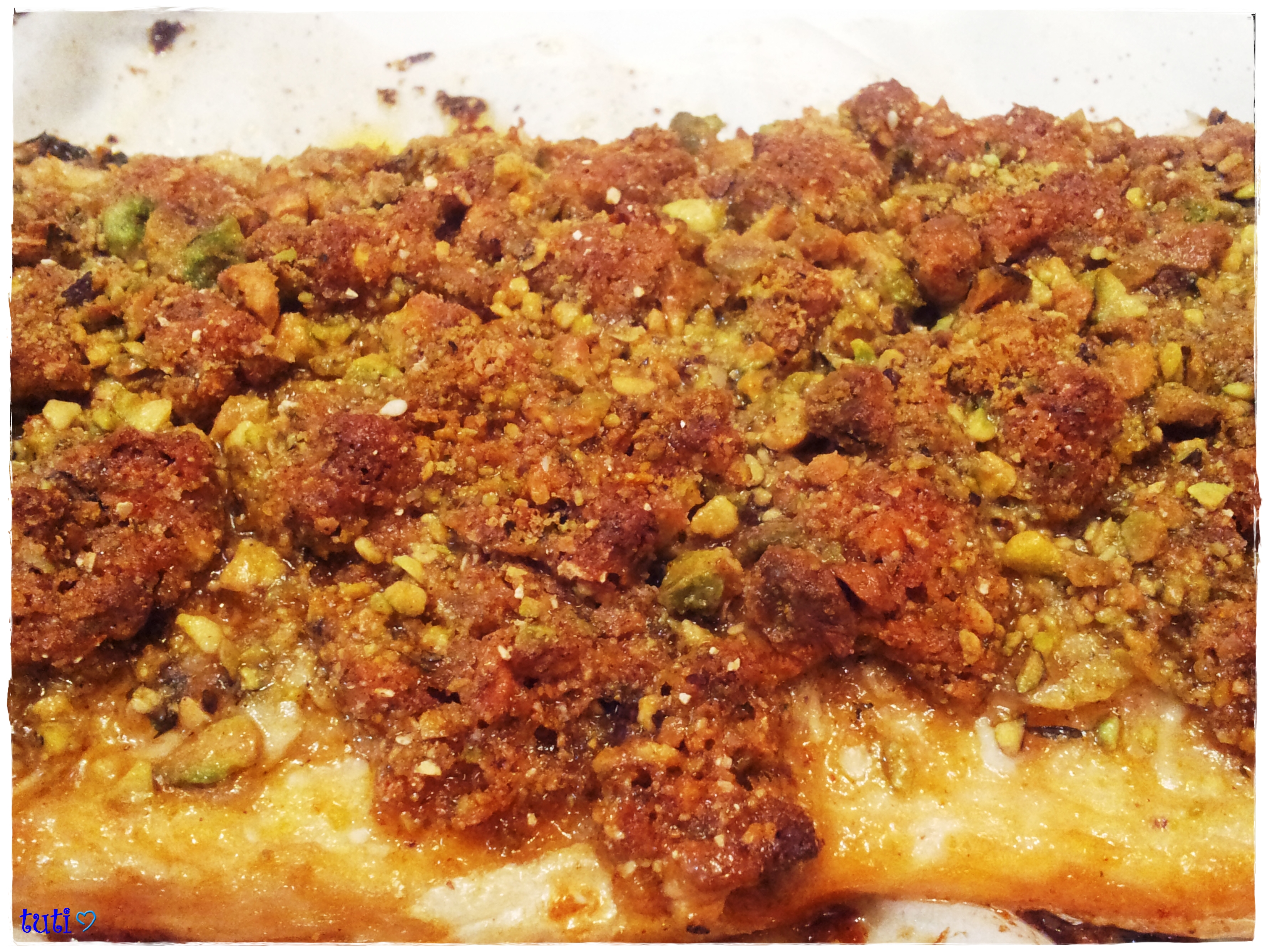 מעל נצפה בשכבה של התערובת (הפיסטוקים, פירורי הלחם, הדבש והתיבול)