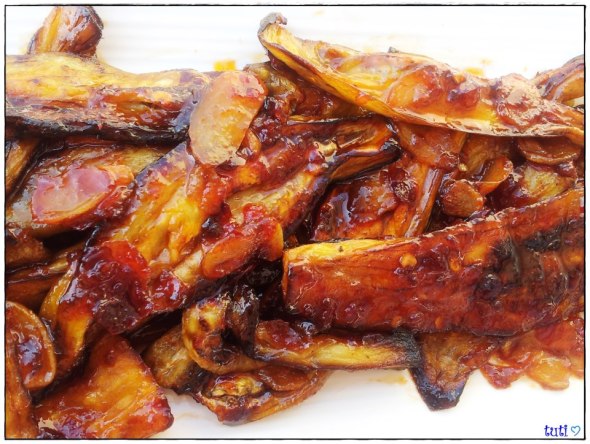 רצועות חציל שנצלה בתנור, מצופה בתערובת של אריסה, דבש, שום ותבלינים.