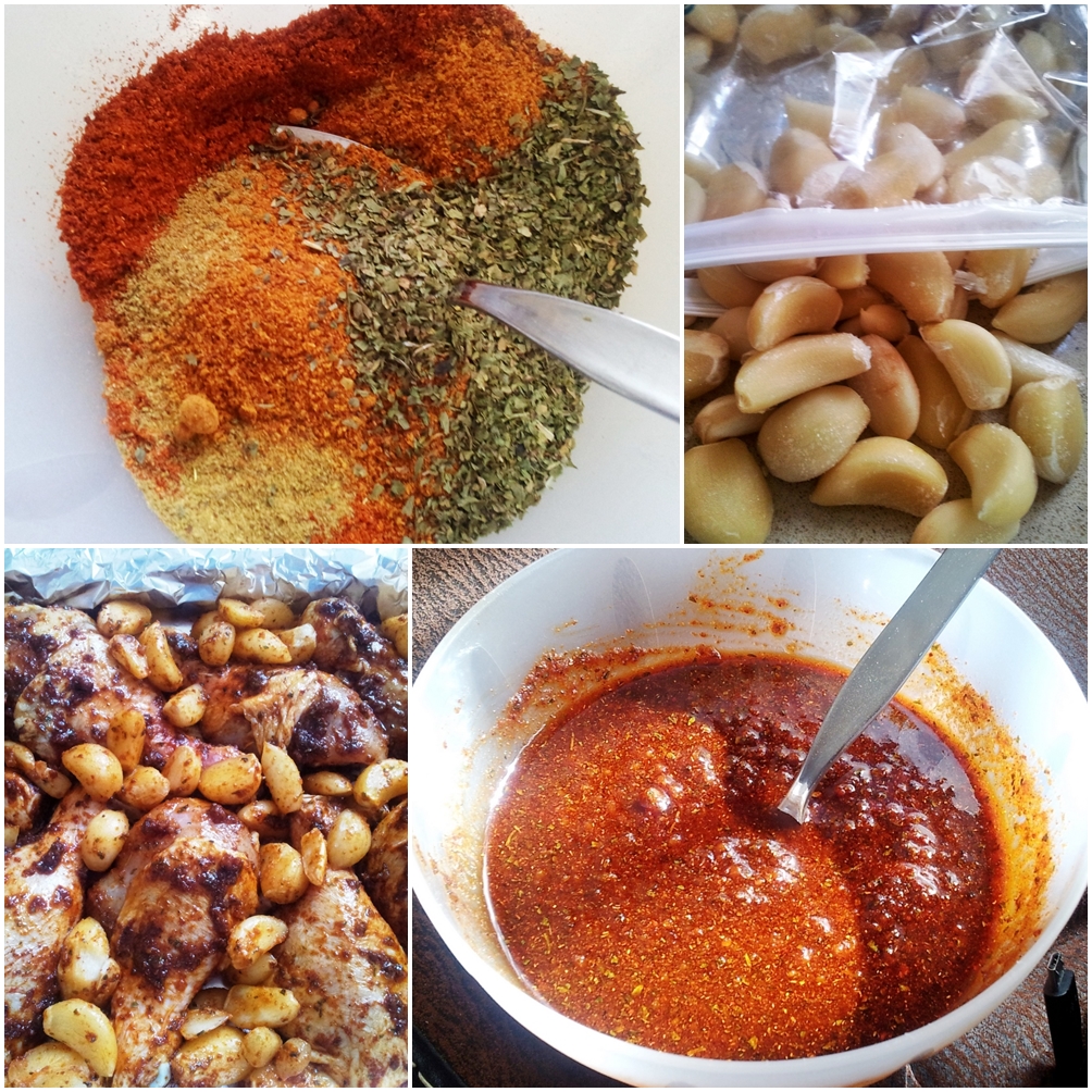 נתחיל עם הכנת המשחה, בתוך צלוחית נערבב את כל התבלינים, השום והשמן