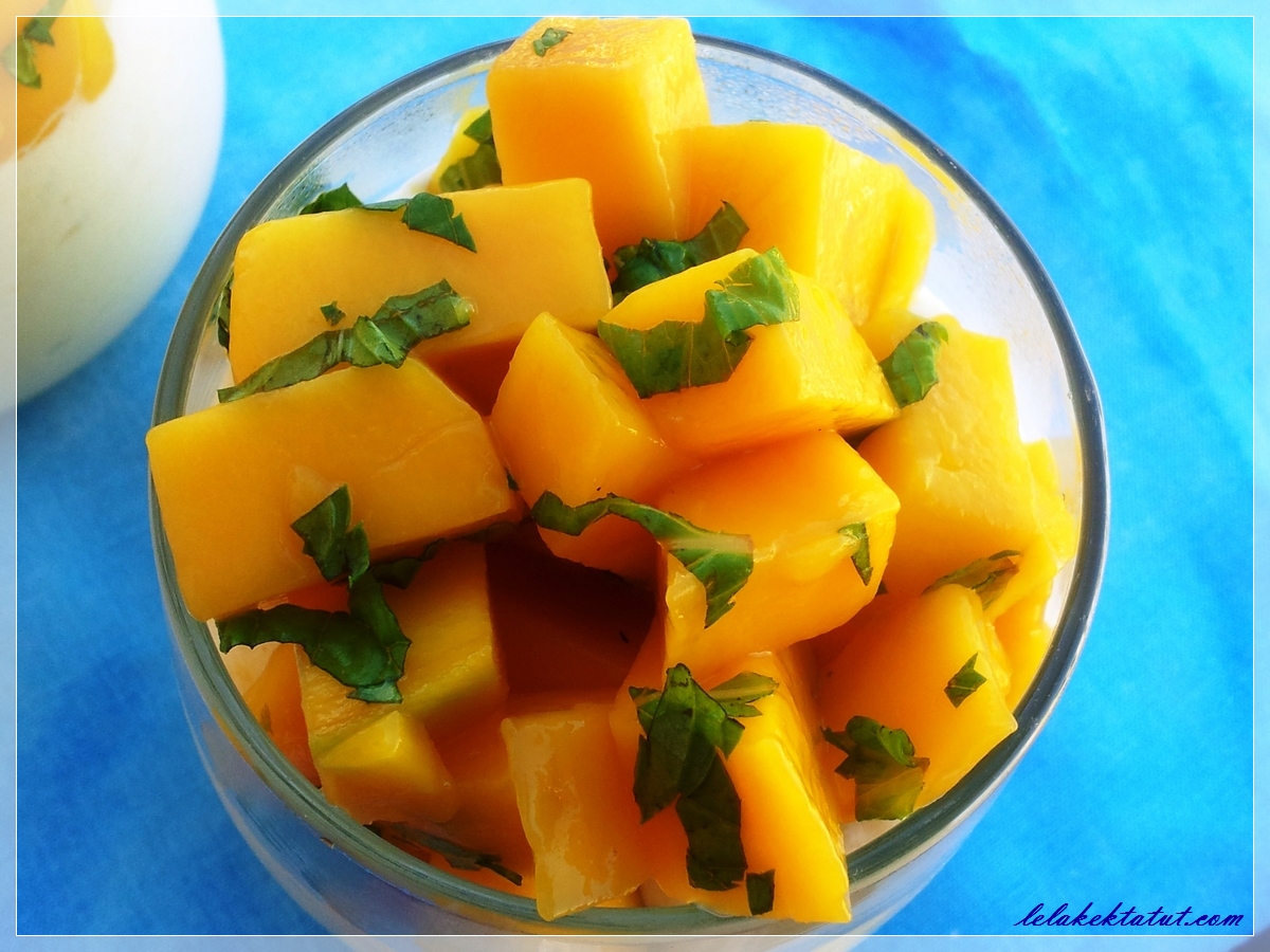 נקלף את המנגו לקישוט, נחתוך לקוביות קטנות ונוסיף את עלי הנענע הקצוצים,