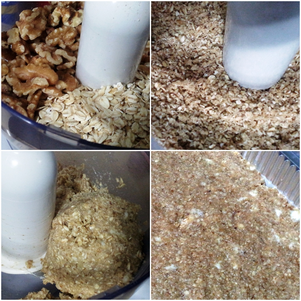 נכניס את שיבולת השועל ואגוזי המלך למעבד המזון, נרסק עד למצב של פירורים דקים.