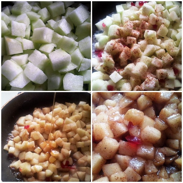 נחמם במחבת את החמאה, נוסיף את קוביות התפוחים והחמוציות ונקפיץ מספר פעמים,