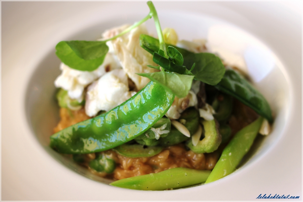 הריזוטו כלל נתחי דניס אפוי במלח ים, אפונה, פול, אספרגוס ירוק ולבן, זרעי כוסברה, שום, צ'ילי, שאלוט,