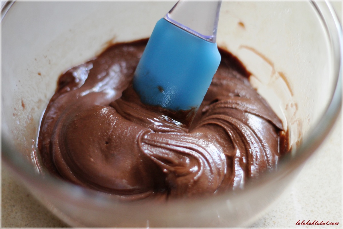 בעזרת מרית נקפל את תערובת השוקולד והביצים יחד, נוסיף את הקמח ונערבב רק עד לקבלת