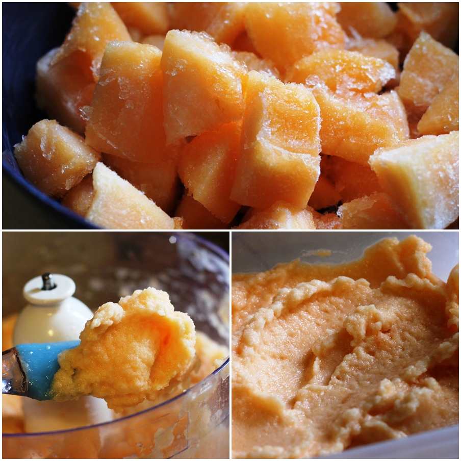 לאחר שקוביות המלון קפאו, נוציא ונעביר למעבד המזון, נוסיף מיץ מחצי לימון, רבע כוס מים ורבע כוס ממתיק.